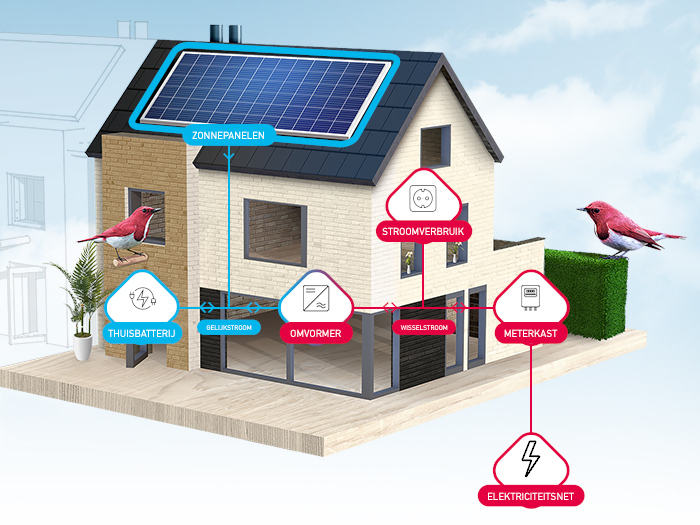 Een thuisbatterij meet - met een speciale stroommeter op de binnenkomende kabel van de teller - hoeveel stroom je zelf verbruikt en hoeveel je over hebt om terug te leveren. Maar in plaats van de overtollige stroom terug te leveren, zal de batterij beslissen om zichzelf daarmee op te laden. Omgekeerd, wanneer je stroom nodig hebt wanneer de zon niet schijnt, zal de batterij beslissen om te ontladen in plaats van dure stroom van het net te halen. Zo kan je dus meer van jouw thuis geproduceerde zonnestroom zelf verbruiken.